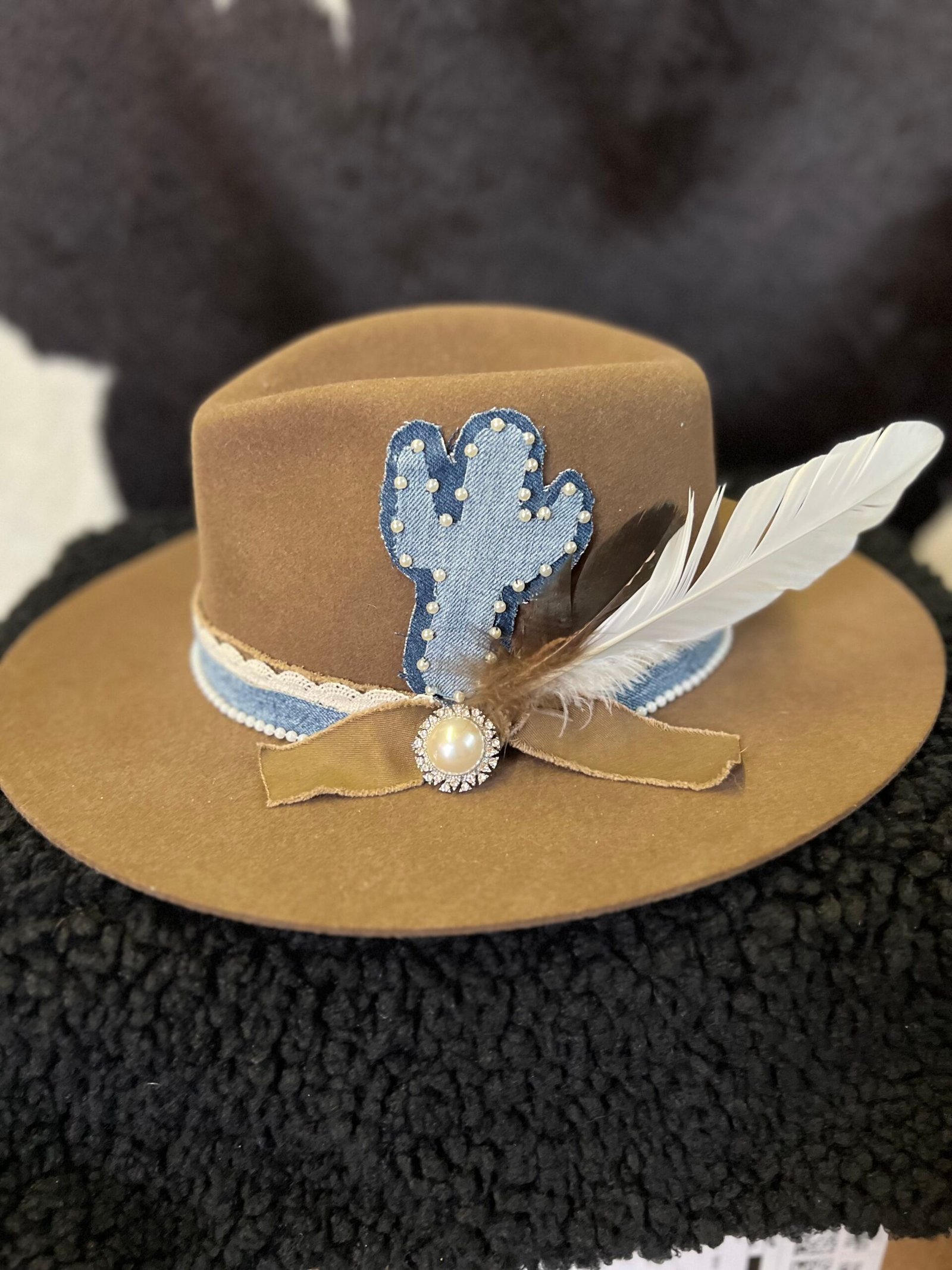 Camel wool felt. Denim cactus lined with pearls with a beautiful large pearl brooch on the side. Fun and elegant, she will be the talk of the town.