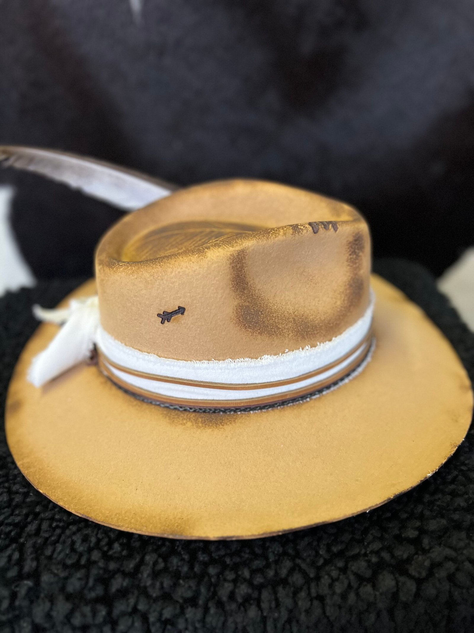 Wool felt, adjustable fit. Crown art and band set with playing card, feathers and turquoise stone is a head turner. Named after the Hanging Dog community in Cherokee County, located in western North Carolina.
