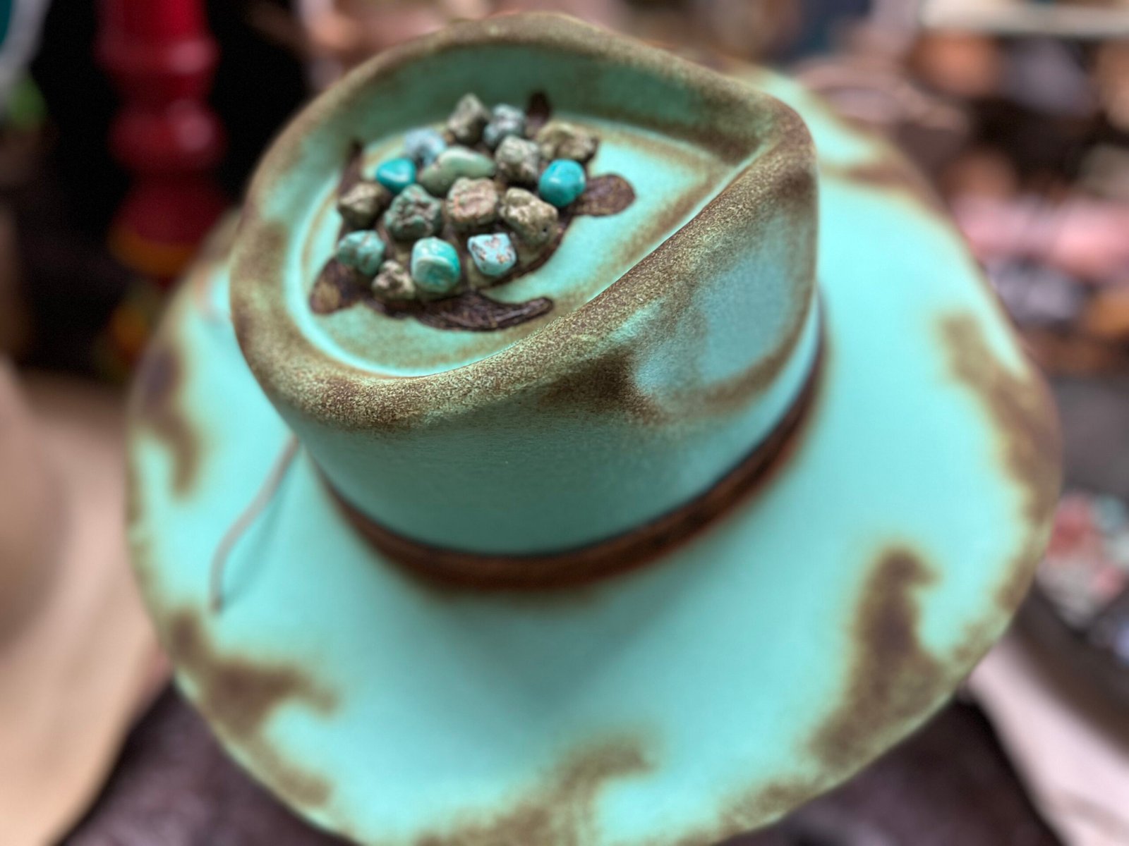 Fire distressed 100% wool, custom color. Keeping our tropical friends in mind, the crown is adorned with turquoise chunks and a sterling silver and turquoise turtle charm is soaking up sun laying on the brim.